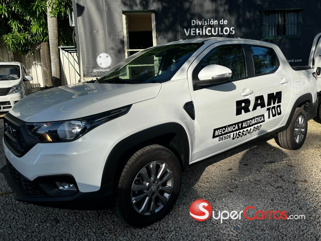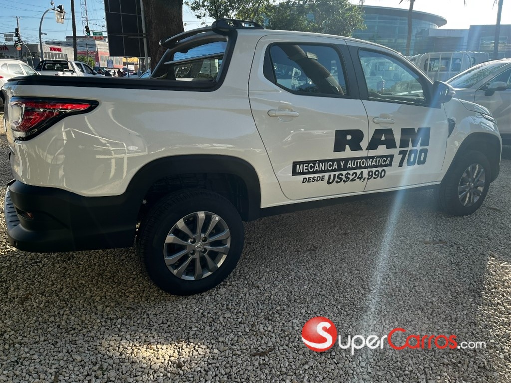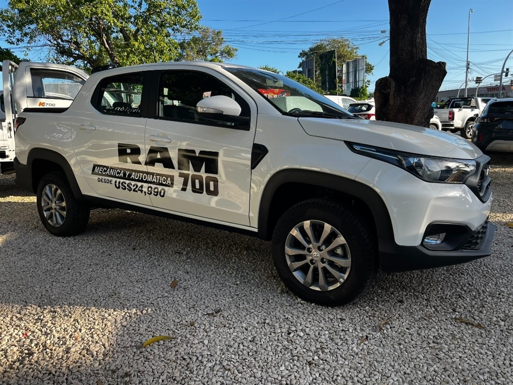 Ram 700 Bighorn -Motor Fire Fly 1.3 litros 8V de 98 hp de gasolina -Transmisión automática CVT con paddle -Tracción delantera -Dirección hidráulica asistida -Modo de manejo Sport -Suspensión delantera -Suspensión trasera de eje rígido Exterior -Protector de cama MOPAR -Tapa de cama MOPAR -Retrovisores eléctricos con luz direccional, lado pasajero con acción adaptable automática en marca “R” -Luces y faros antiniebla -Aros de aluminio de 15” -Protección del cárter de motor -Tapa rueda integral Seguridad -4 airbags: 2 frontales + 2 laterales delanteros -ABS con EBD -Apoyacabezas traseros regulables en altura -Aviso del cinturón de seguridad conductor y pasajero -Bloqueo de diferencial electrónico -Cinturones de seguridad traseros con carrete -Control electrónico de estabilidad -Hill Start Assist - Asistente de arranque en rampa -Control de tracción (TC+) -Sensores de reversa -Seguros eléctricos -Sistema de alarma Interior -Gear Shift Indicator -Asientos tapizados en tela premium con textura -Cargador inalámbrico para Smartphones -Pantalla táctil de 7”, con Apple Car Play y Android Auto inalámbrico. Puerto USB y Aux -Cámara de reversa con guías activas -Volante forrado en piel con controles de teléfono y audio, con graduación para altura -Computadora a bordo -Volante Forrado en Cuero -Zona de Carga -Barras de protección del vidrio trasero -Iluminación de la zona de carga -Protección de la superficie de carga -Capacidad de carga de 650 k