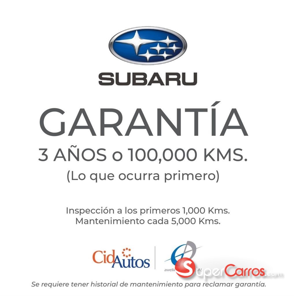 Observaciones: • Financiamiento hasta 7 años para pagar. • Aprobación y entrega inmediata. • Recibimos tu vehículo como parte del pago. • Garantía 3 años o 100,000 KMS. • Seguro FULL hasta 12 meses para pagar. • Asesoría durante todo el proceso. Tecnología: • Guía Multifunciones con diseño de 3 puntas forrado en piel. • Controles de Radio y computadora de abordo en el Guía. • Luces y limpiavidrios automáticos. • Radio con doble pantalla de 7” pulgadas c/u, táctil a color. • (MP3 Player), bluetooth, entradas USB. • Sistema de sonido con 4 altavoces. • Sistema X-mode para condiciones todo terreno. • Subaru SI-DRIVE (modo de manejo inteligente y sport). • Sistema de reconocimiento de voz. • Android Auto y Apple Carplay. • Conexión de Teléfono por Bluetooth. • Keyless entry & keyless start (acceso y encendido sin llave). Seguridad: • 8 Airbags (frontales, laterales, cortina, rodilla y cojín). • Sistema de inmovilización. • Programa electrónico de estabilidad (ESP). • Sistema de control de tracción (TCS). • Sistema de control de descenso. • Barras protectoras en las 4 puertas. • Sistema de detección de fatiga del conductor. • Ganchos ISOFIX para asientos de infantes. • Sistema de frenos de discos delanteros y traseros ventilados. • Sistema antibloqueo de regulación electrónica (ABS). • Retención automática del vehículo.
