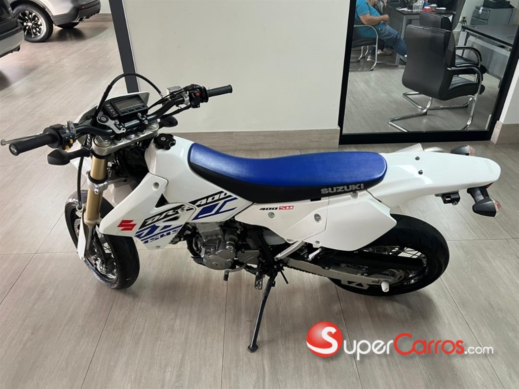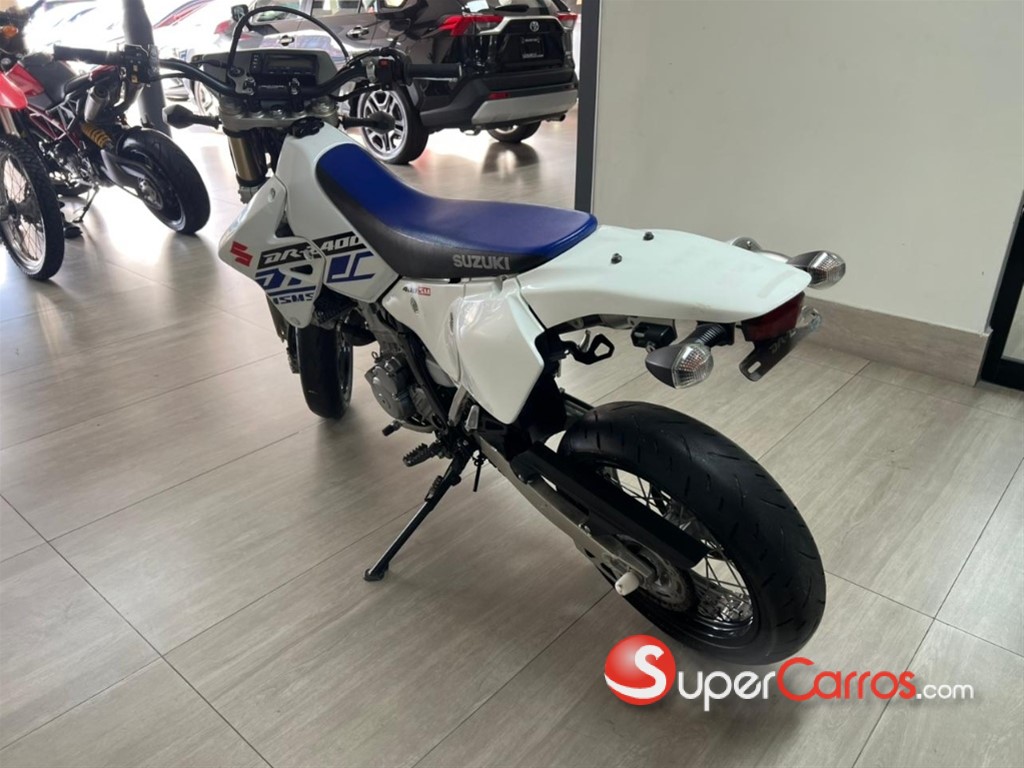 Suzuki DR-Z400SM La versión SM es la variante supermotard (Aros 17” para asfalto) de la DR-Z400. ?? Especificaciones principales Motor: Monocilíndrico, 4 tiempos, DOHC Cilindrada: 398 cc Refrigeración: Líquida Carburación: Mikuni BSR36 (carburada) Transmisión: 5 velocidades Potencia: 39 hp Peso en orden de marcha: aprox. 146 kg ?? Características destacadas Aros 17” con neumáticos deportivos (supermotard) Suspensión invertida totalmente ajustable Chasis ligero y muy maniobrable Excelente para ciudad y manejo agresivo en curvas Mecánica muy confiable y fácil de mantener ?? Ventajas ? Muy divertida ? Bajo costo de mantenimiento ? Motor resistente ? Ideal para uso urbano
