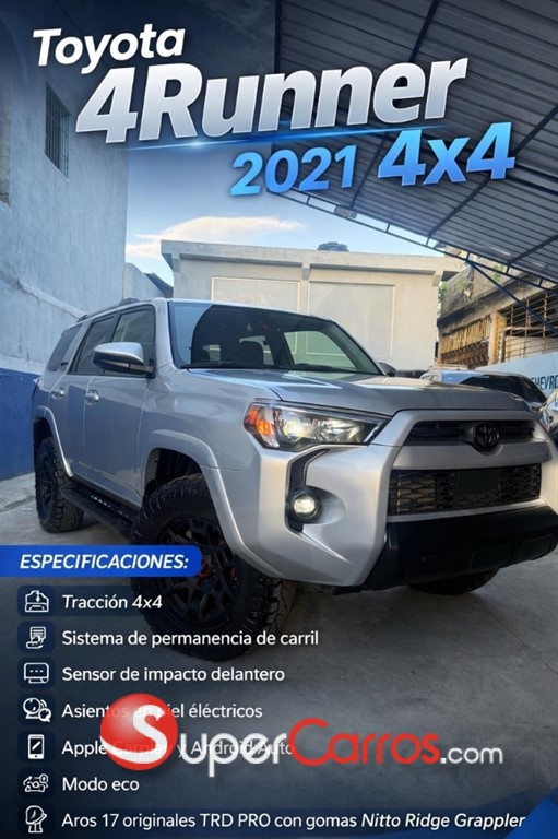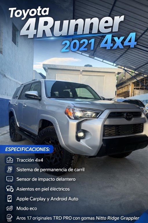 Runner SR5 2021 Tracción 4x4 Sistema de permanencia de carril Sensor de impacto delantero Asientos en piel eléctricos Apple Carplay y Android Auto Modo eco Aros 17 originales TRD PRO con gomas Nitto Ridge Grappler Garantía en motor y transmisión Recién importada, primera matrícula a tu nombre Más información: 849-358-2906