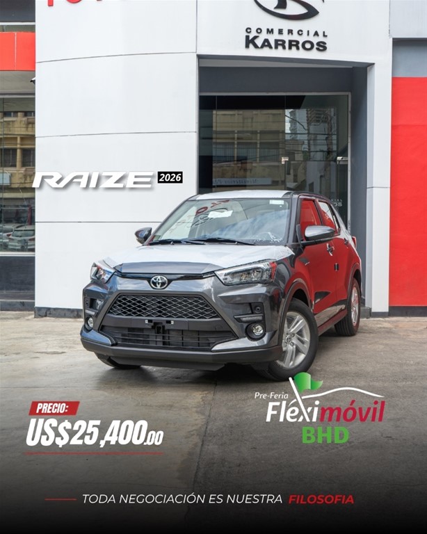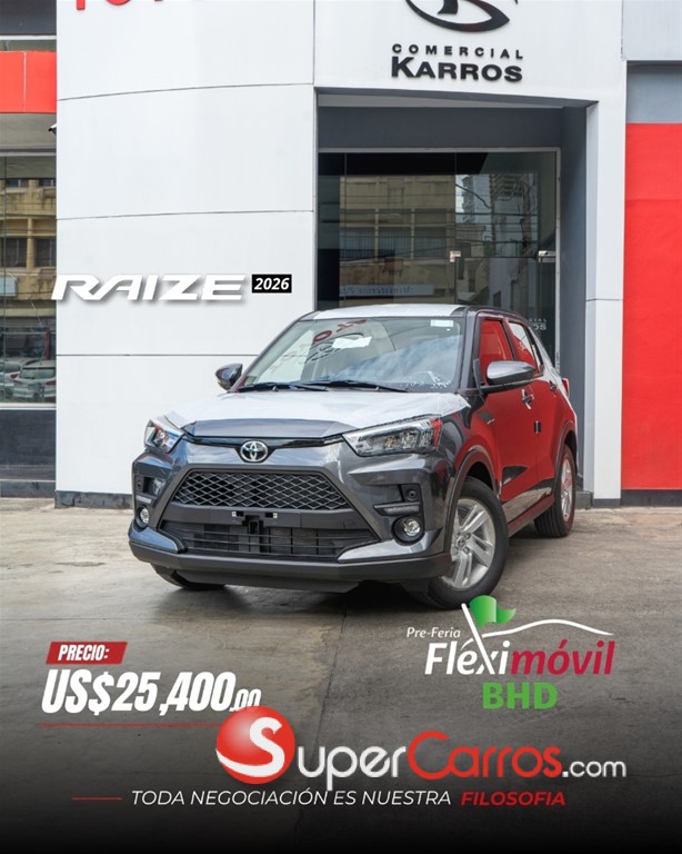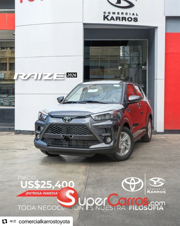 TOYOTA RAIZE TURBO / 2024 BLANCO 4X2 * LA SUV MAS VERTSATIL Y COMPACTA ,CON LA CALIDAD INIGUALABLE DE TOYOTA, 3 AÑOS DE GARANTIA O 100,000KM. RECUERDA QUE SOMOS COMERCIAL KARROS TU MEJOR OPCION, NO DUDES EN CONTACTARNOS, TENEMOS MUCHAS UNIDADES DISPONIBLES PARA ENTREGA INMEDIATA!!! PROPULSION Y TREN MOTRIZ: -Motor 1,000cc, 3 cilindros TURBO 12 valv DUAL VVT, gasolina 88 HP -Consumo promedio de 52km por galon de gasolina -Automatica CVT de 7 velocidades con Paddle Shift -Frenos de discos delanteros 15 y tambor con ABS -Suspension delantera Macpherson -Suspension trasera barra de torsion -Neumaticos 205/65 R17 -Traccion 2WD EQUIPAMIENTO: -Llave inteligente -Radio AM/FM/CD/MP3/Bluetooth/ Android Auto + Apple Car Play -Guia multifuncion con ajuste telescopico -Camara de reversa -Sensor de parqueo trasero -Aire Acondicionado digital -Espejos con direccionales -Luces delanteras LED -Luces traseras LED -Luz de halogenos delanteros -6 Airbags -Sistema de inmovilizador -Cinturones de seguridad multipuntos -Vidrios y seguros electricos -Tablero multifuncion digital -Asientos en tela tipo sport -Limpia vidrios traseros -Emergencia -Reloj digital -Barras laterales contra impacto -Kit de herramientas Auxiliares -Goma de repuesto * Financiamiento disponible con aprobación inmediata y las mejores tasas del mercado. * Recibimos tus vehículos como parte del pago por la compra al mejor precio del mercado. * Gestionamos tu seguro full o de ley segun requieras. * Factura con valor fiscal disponible CONTACTO: 829-798-2898 Carlos Payano 809-913-7701 Gregory Rodriguez 849-850-3114 Federico Lopez 829-871-5997 Josue Martinez